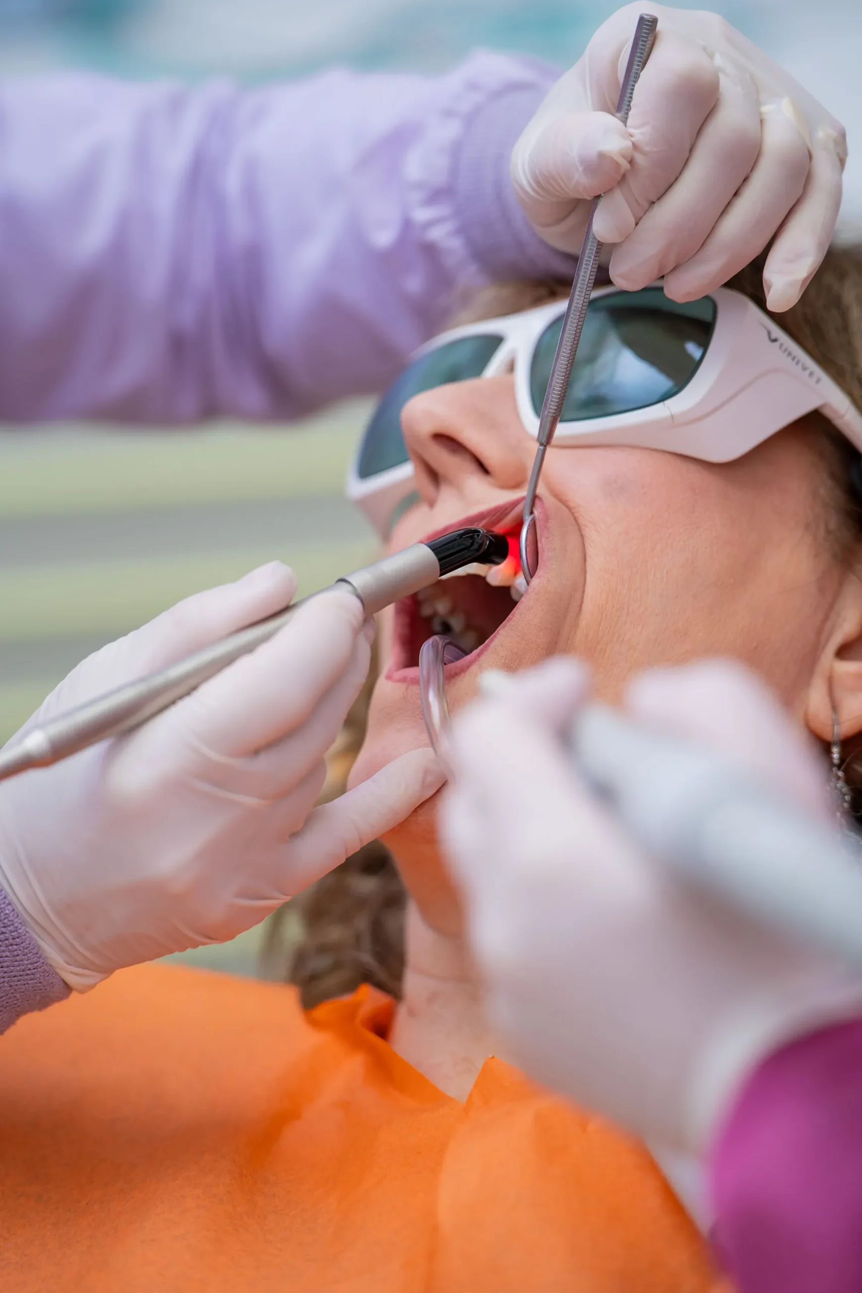 I laser utilizzati in studio consentono trattamenti indolori e mini-invasivi sia sui tessuti molli come le gengive – perché riducono il sanguinamento e accelerano la guarigione – sia sui tessuti duri, come nel trattamento delle carie o delle infezioni dell’osso. Risultano particolarmente indicati nei pazienti oncologici, pediatrici, ansiosi, e affetti da malattia parodontale.