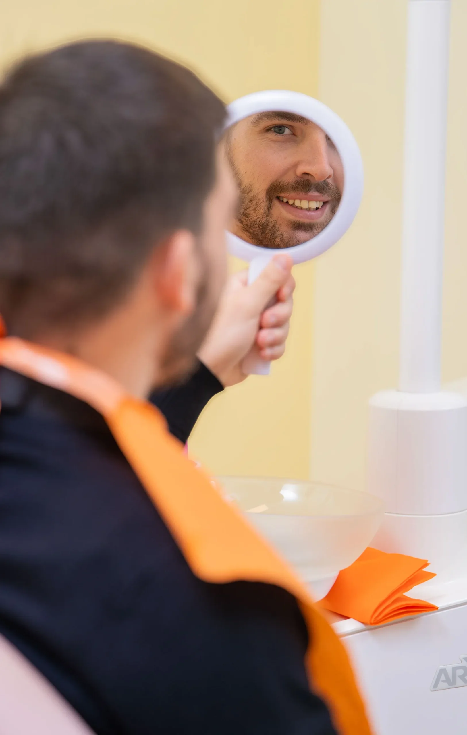 Una volta terminata la parte dedicata all’ascolto, consegniamo al paziente uno specchio: osserviamo la bocca insieme, punto per punto, iniziando dal parodonto — gengive e tessuti di sostegno — perché è da qui che parte la vera salute orale. Durante l’ispezione mostriamo in modo chiaro la presenza di eventuali segni di malattia: gonfiore, rossore, sanguinamento, recessioni, perdita di compattezza dei tessuti.