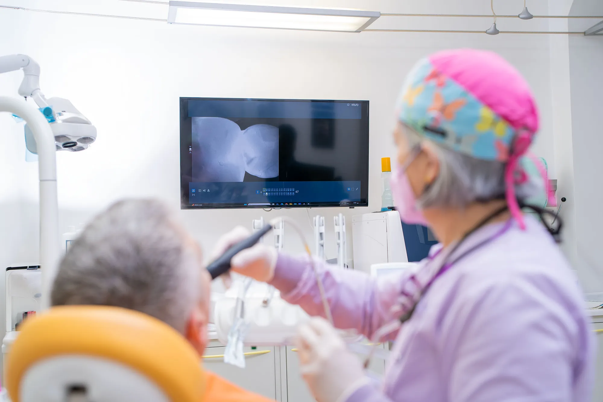 Grazie a questo strumento possiamo “vedere l’invisibile”, mostrando in modo immediato ciò che accade all’interno del dente senza ricorrere a radiazioni. Se necessario, poi, eseguiamo radiografie mirate: solo quelle utili, che vengono esaminate e discusse in presenza per poter formulare un piano terapeutico chiaro.